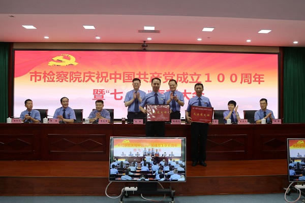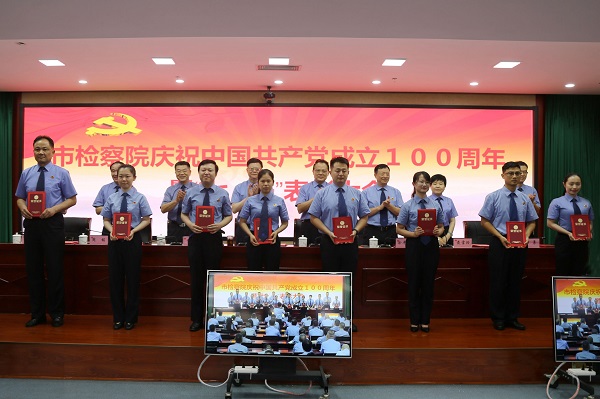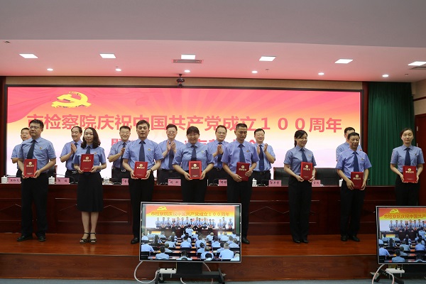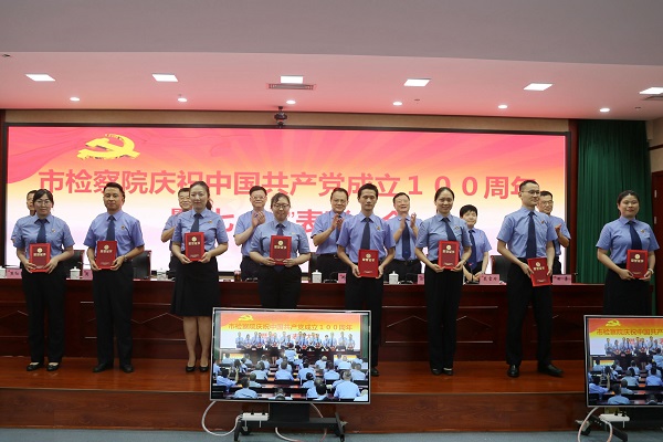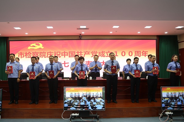 大会在激昂的国歌声中拉开帷幕,院党组副书记、副检察长邓修作宣读了市院机关2020-2021年度“七一”表彰决定,院领导为荣获优秀共产党员、优秀党务工作者和先进基层党组织的个人和集体颁发了证书奖牌。