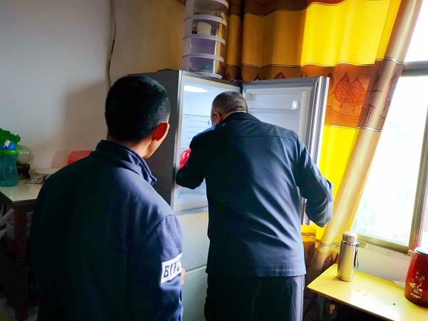 走进脱贫户金贤德家中,刘鸿斌打开冰箱,走进厨房,详细了解一家人生活情况。
