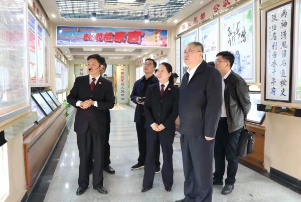 刘鸿斌、徐强一行参观了进贤县检察院12309检察服务中心、院史陈列室、荣誉室、检察文化长廊、视频集控中心和远程提讯室等地,详细了解该院办公办案环境及特色亮点工作,并与该院班子成员进行座谈交流。