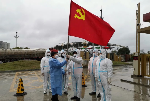 3月22日11时50分,第一组突击队员提前来到卡点,他们第一项工作是把党旗高高悬挂起来,既激励队员们在疫情一线践行初心使命,也让过往群众充分感受到党的伟力无时不在。