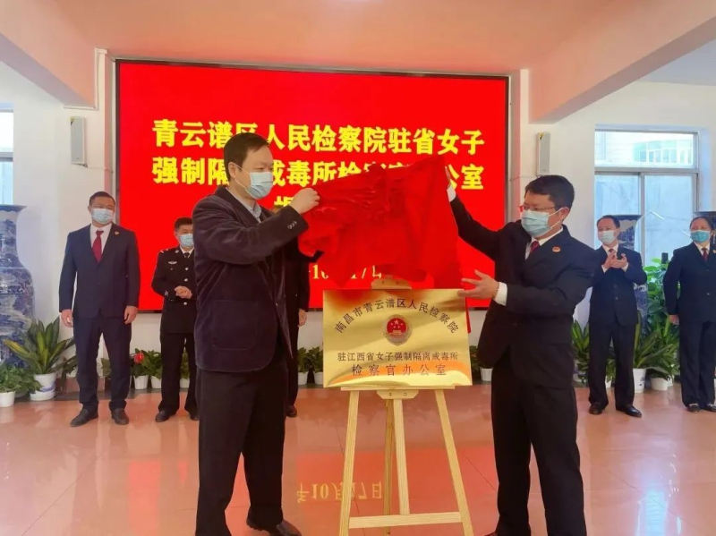 为加强行政执法领域检察监督,依法保障涉毒人员合法权益,10月17日,青云谱区检察院驻江西省女子强制隔离戒毒所检察官办公室揭牌仪式在江西省女子强制隔离戒毒所举行。江西省检察院第七检察部主任龚永斌,江西省司法厅监所工作处处长刘平,江西省戒毒管理局党委委员、副局长齐明珠,南昌市政协副主席、市检察院副检察长薛有旺,江西省女子强制隔离戒毒所党委书记、所长邹春粮,青云谱区检察院党组书记、检察长唐景扬,市检察院第五检察部主任刘龙军,副主任陈丽,青云谱区检察院副检察长张春燕以及江西省女子强制隔离戒毒所、青云谱区检察院部分干警出席揭牌仪式。