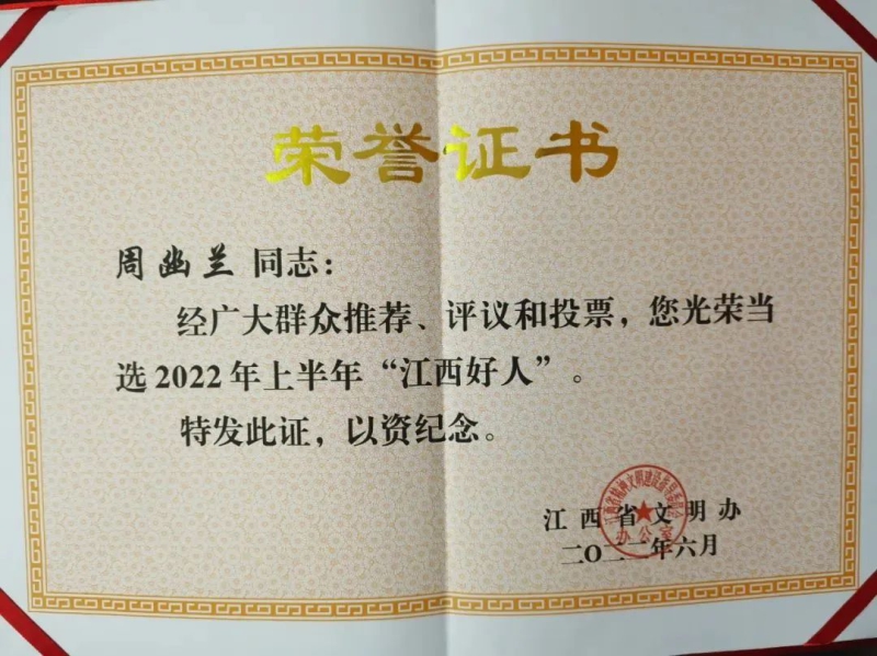 她的事迹多次被市、县电视台报道。2015年以来,她先后荣获“南昌县第四届道德模范”、南昌市“最美志愿者”、南昌县“最美职工”、南昌县“最美志愿者”、南昌县“身边好人·每季之星”、南昌县“创建全国文明城市先进个人”等荣誉,2021年1月被评为南昌市“文明市民”。她创立的幽兰爱心协会也获得南昌市最佳志愿服务组织、南昌市“兴家风、淳民风、正社风”榜样团体等荣誉称号。
