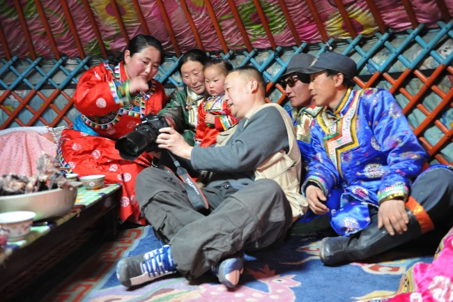 退休后,赵如意踏上了草原骏马拍摄之路。图为他(手持相机者)和牧民一同欣赏镜头下的牧区生活。 丁丁摄